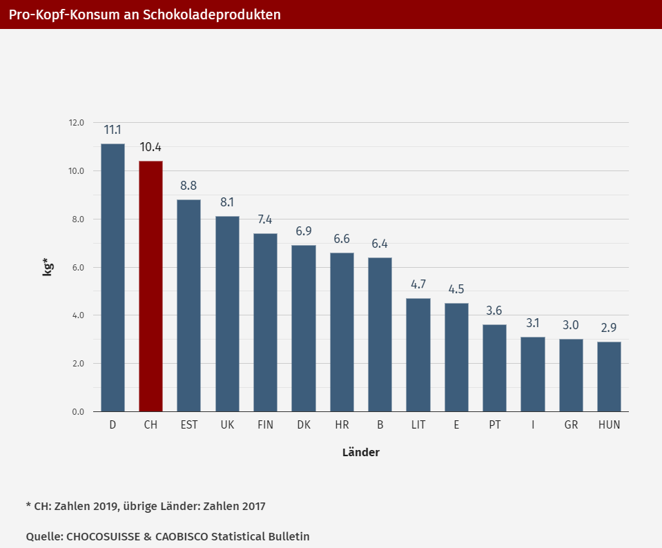 => Früher war die Schweiz mit rund 10,4 kg pro Jahr das Land mit dem höchsten Schokoladenkonsum pro Person.